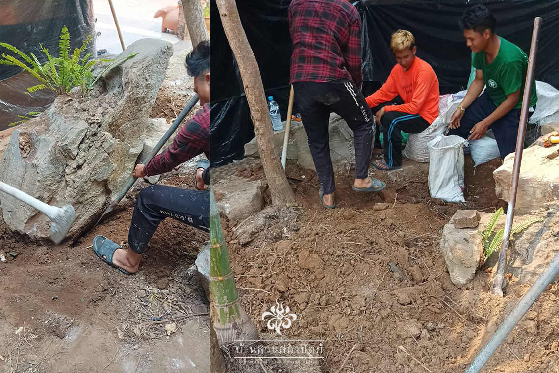 4. การใช้หินเพิ่มเติม : อาจจำเป็นต้องเพิ่มหินธรรมชาติเพื่อให้ได้รูปทรงน้ำตกที่สมบูรณ์แบบ
