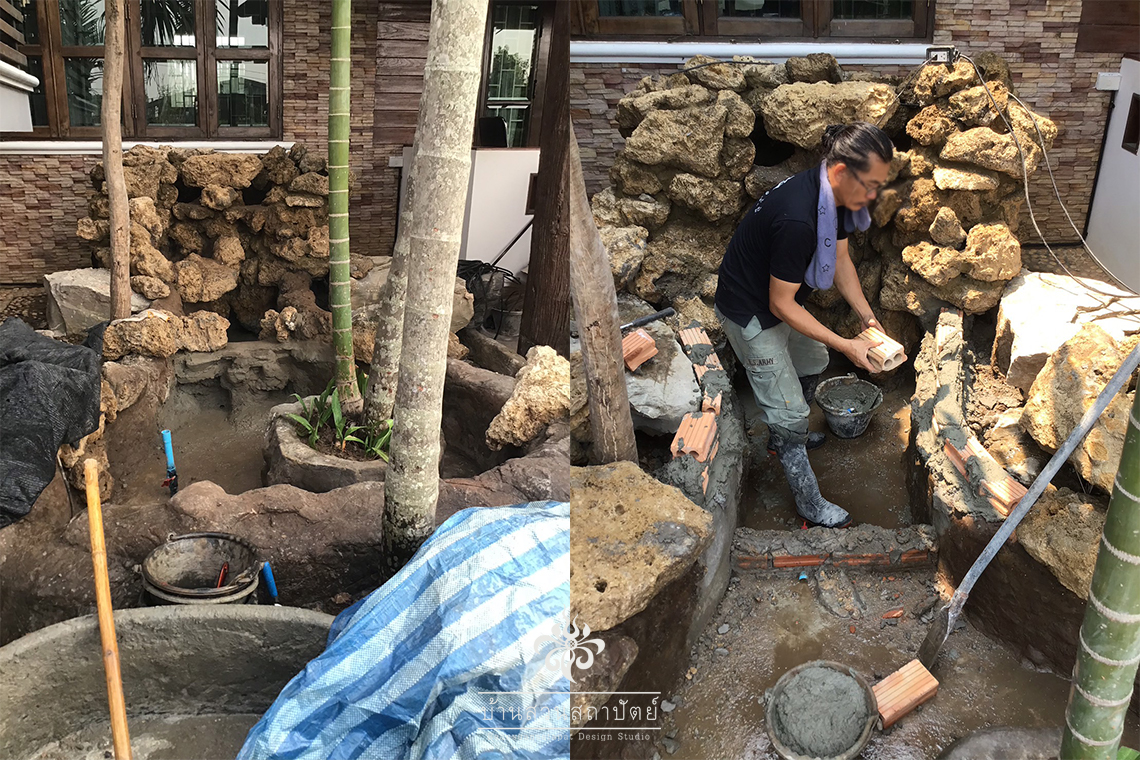 งานออกแบบ รับเหมาก่อสร้าง ปรับปรุงภูมิทัศน์ สวนน้ำตกหินเทียมและหินฟองน้ำ